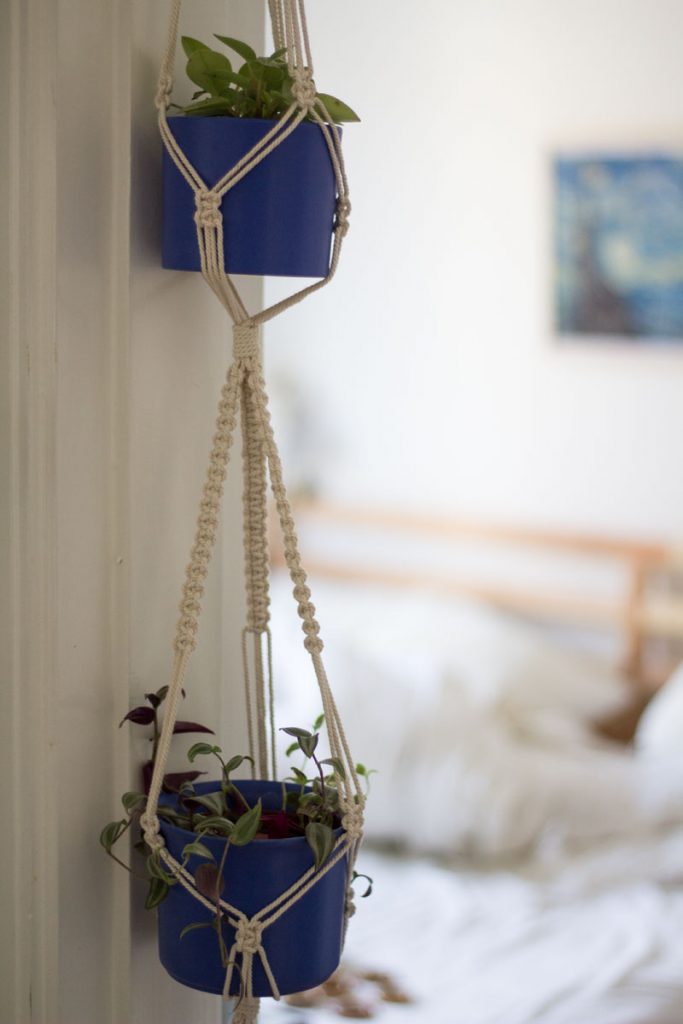 Så på Erikshjälpen, där jag för övrigt varit klart färst (ja, det heter tydligen så, mvh blivande förskollärare) gånger, letar jag alltid krukor! Om inte tanterna hinner först, hehe, så brukar där finnas fina för billiga pengar. Som de här två blå, som kostade 10 kronor stycket, och som med lite makramérep fick bli en ampel! Snabbt, billigt, enkelt och snyggt, samt perfekt för mig som börjar få… eh… lite ont om plats i våra fönster, så att säga, hehe.